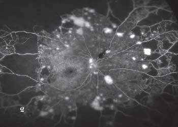 (糖网患者的眼底荧光血管造影检查显示血管渗漏、新生血管和视网膜缺血区)