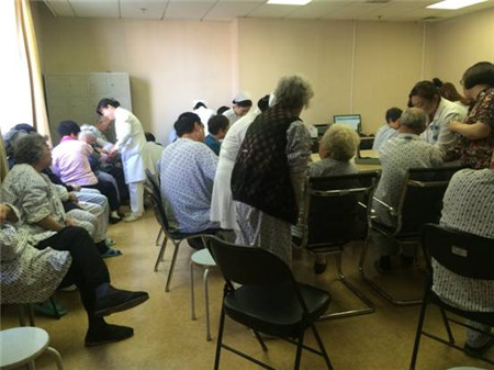 2015年5月20日下午,神经内科8A示教室里热闹非凡,30多位患者、家属以及近20名医护人员聚集在一起,中间的书桌上摆放着10余台血压计。原来,神经内科党支部、团支部和工会小组一起为患者和家属讲解测量血压的方法。