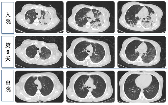 第9天,肺部CT提示双肺高密度影显著吸收,血红蛋白逐渐上升至70g/L,血氧分压正常。