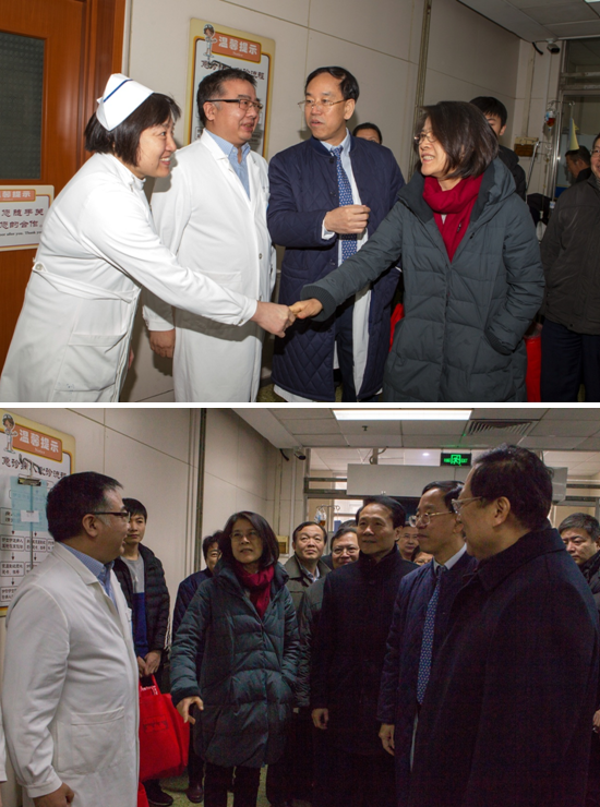 北京大学党委书记郝平,常务副校长柯杨,党委副书记敖英芳,副校长、总务长王仰麟,理学部主任饶毅,两办主任郭海,党委组织部部长柴真,学科建设办公室副主任张存群;北京大学医学部主任詹启敏,党委书记刘玉村,副主任、两办主任肖渊等领导,在北京大学人民医院院长姜保国,党委书记赵越,副院长张俊、刘玉兰、王建六、李澍,党委副书记陈红松、郭静竹,院长助理王天兵的陪同下,先后来到胸外科、血液病研究所和急诊科,为临床一线医护人员送去新春祝福。