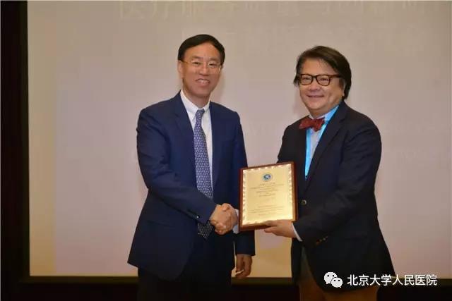 在随后举行的陈比利博士“北京大学创伤医学中心名誉顾问”荣誉称号授予仪式上,北京大学创伤医学中心主任、北京大学人民医院院长姜保国将“北京大学创伤医学中心名誉顾问”的证书授予陈比利博士手中,以表彰陈比利博士在促进北京大学创伤医学中心和澳门科技大学健康科学学院的合作交流方面做出的卓越贡献。