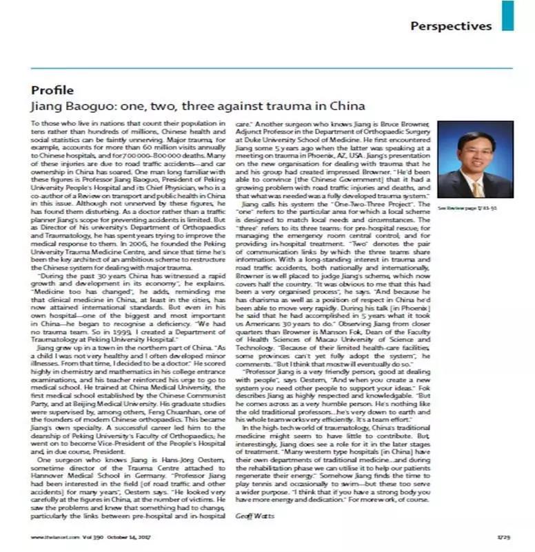 在发表综述文章的同时,《柳叶刀》对姜保国教授进行了人物专访,介绍了姜保国教授十余年来,带领团队致力于改善医疗机构对道路交通伤的应急反应工作机制,设计中国严重创伤救治体系方案的经历、成就和体会,并收录了三位国际知名专家的观点。