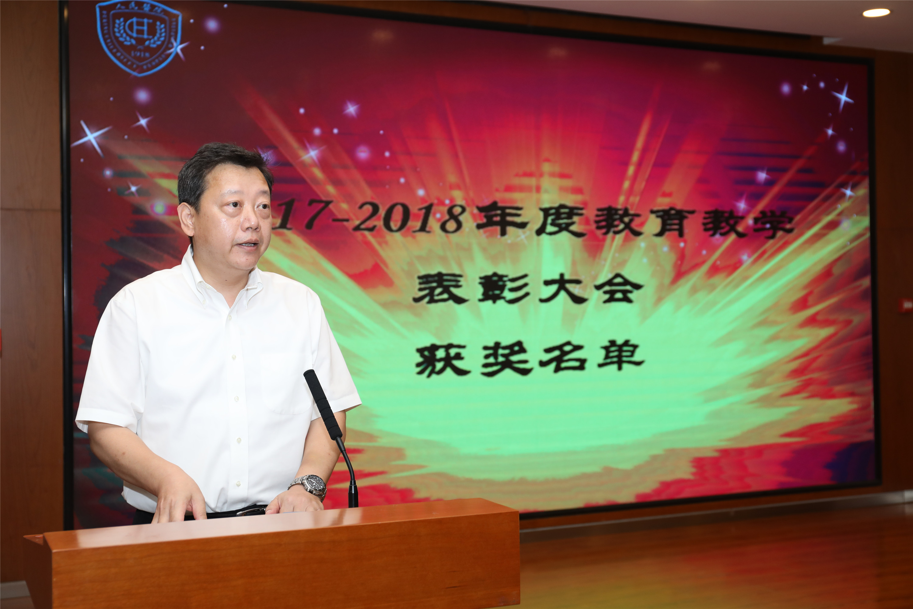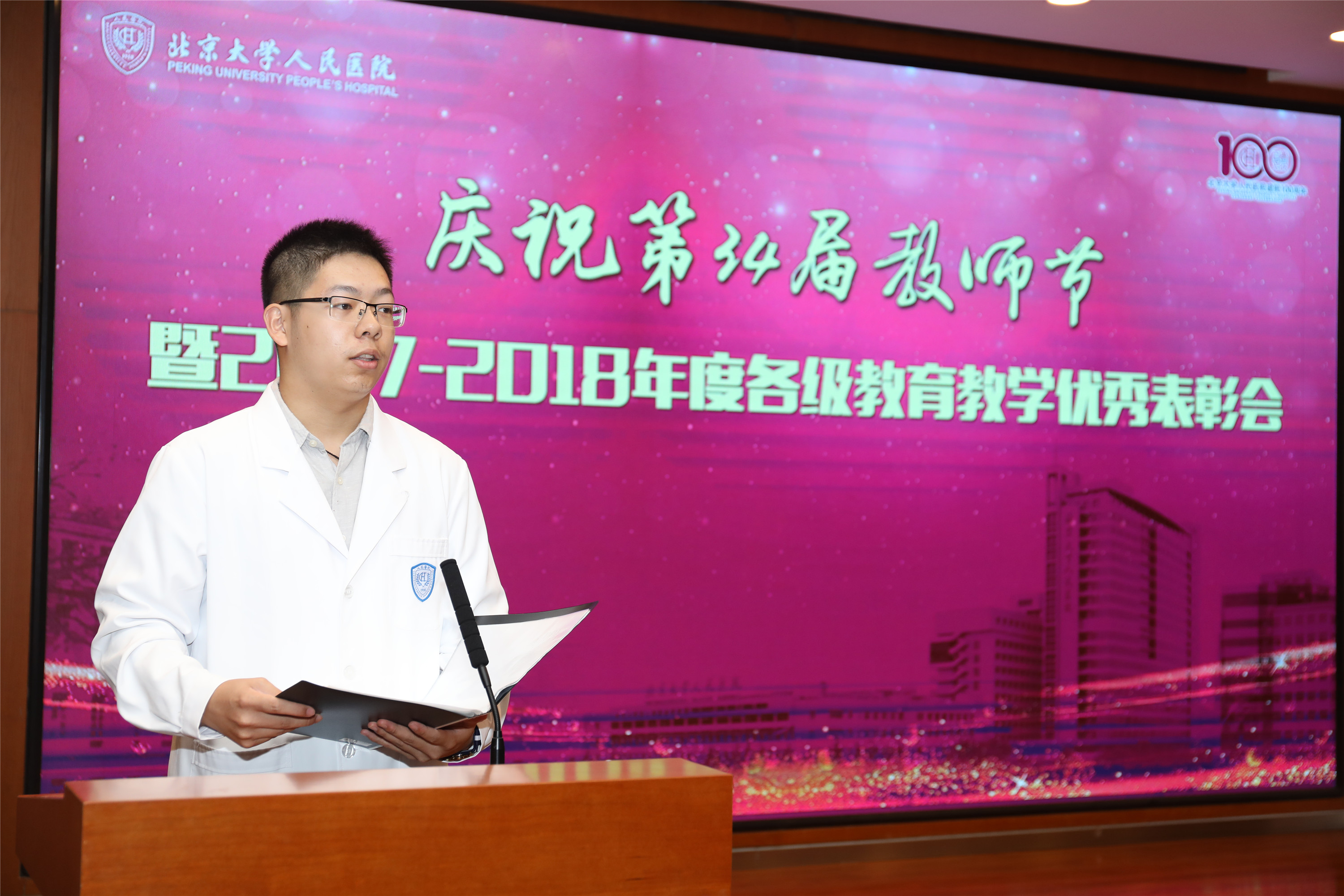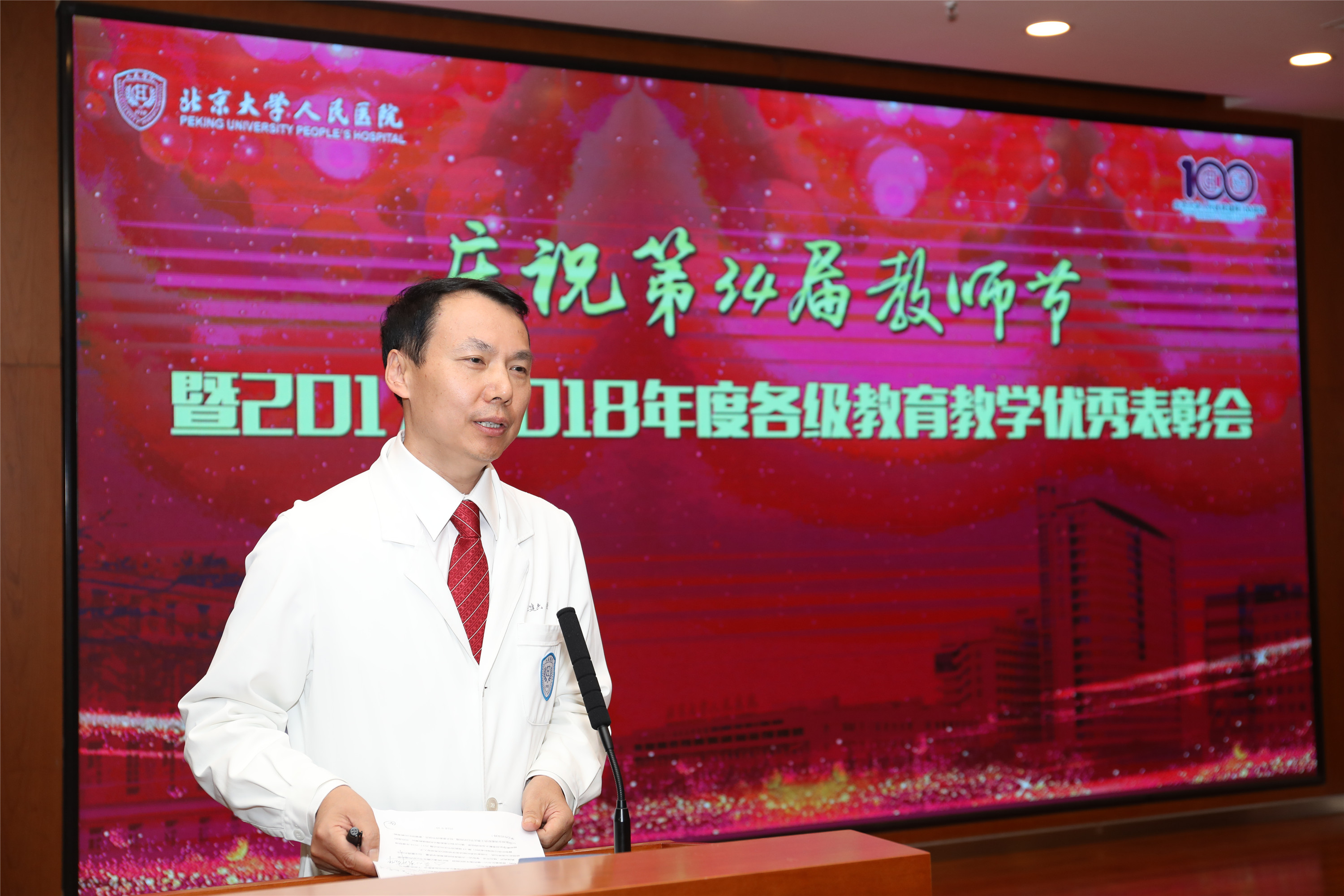 医院党委副书记陈红松宣读2017—2018年度北京大学、医学部、人民医院各级教育教学获奖名单,并向所有获奖的教师和集体致以诚挚的祝贺。