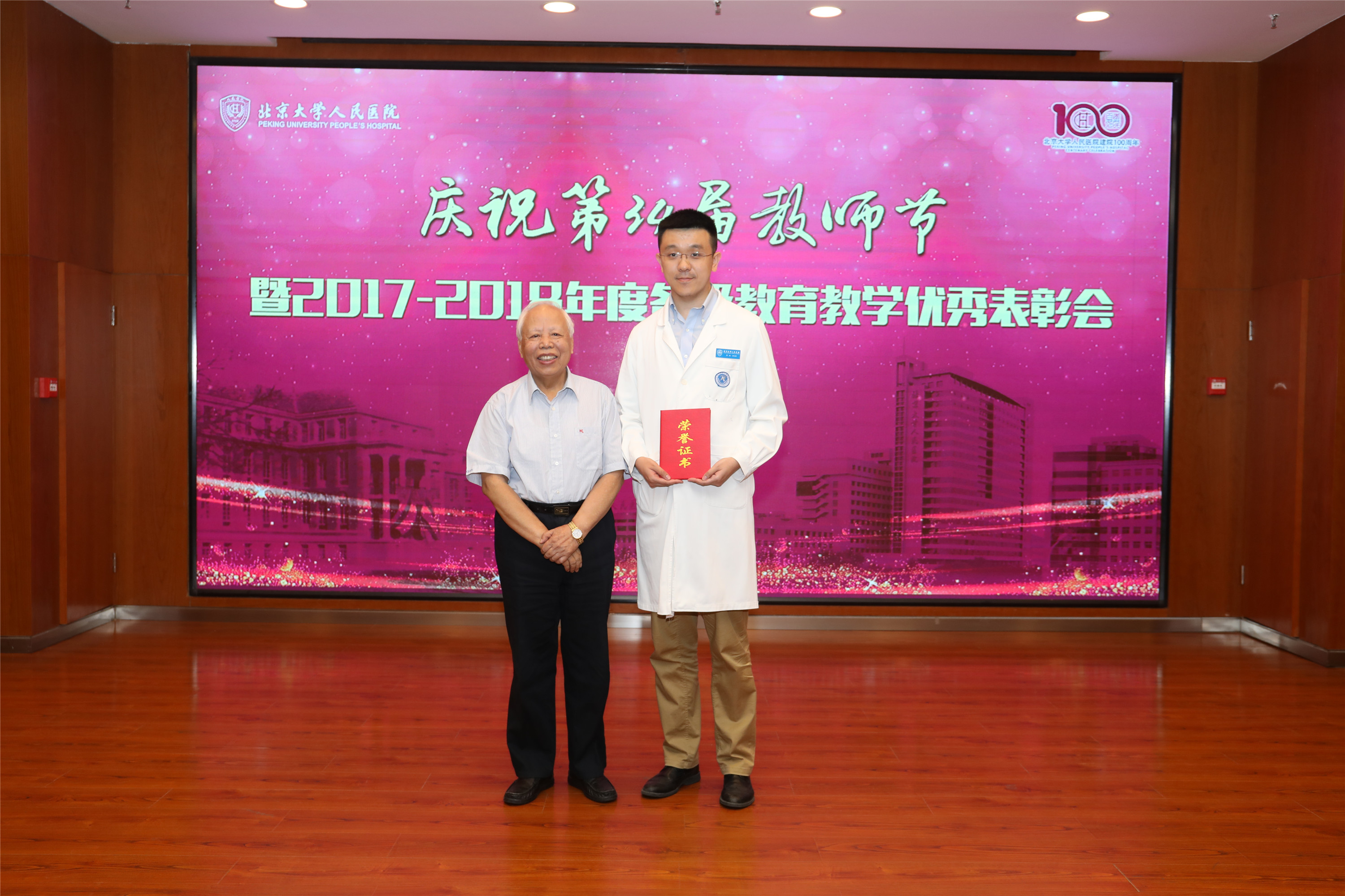 原北大党委书记、原北大人民医院副院长王德炳教授、北大医学部教育处刘虹副处长和北京大学人民医院副院长李澍、党委副书记陈红松、郭静竹等医院领导为2018年北京大学人民医院第24届教学基本功比赛获奖者颁奖。
