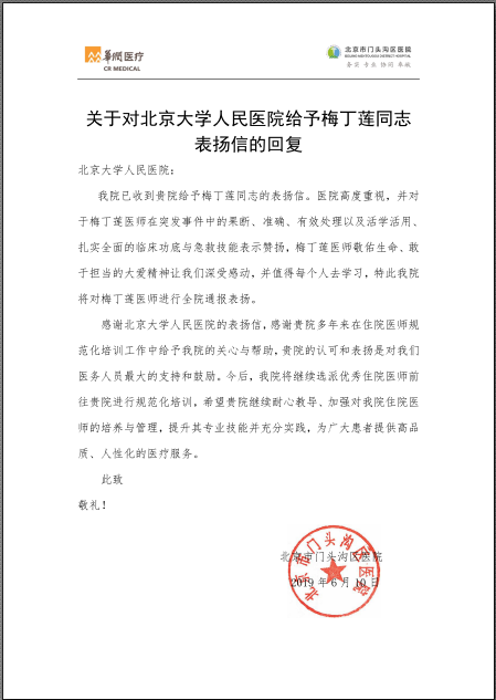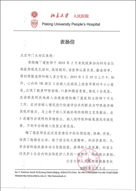 梅丁莲医师马上停下手头工作,一边安排1床病人去医生办公室寻找吴奶奶的管床大夫,一边对吴奶奶的情况进行快速评估,在确定为呼吸道异物误吸后,她立即对病人实施了标准的海姆立克急救法,经过3次操作,不到半分钟,吴奶奶误吸的异物排出,呼吸和缺氧情况得到有效改善,上级医师和护士长赶到时吴奶奶已经恢复正常状态。吴奶奶握着梅丁莲医师的手,不断的说:“谢谢你救了我,谢谢!”直到出院,每次见到梅大夫,吴奶奶都会再表达自己的感谢。梅丁莲医师在紧急情况下体现出的扎实的临床基本功,也得到了北京大学人民医院心内科科室主任、护士长、带教老师和一众规培小伙伴的由衷称赞。带教的北大人民医院宋俊贤老师拨通了北京大学人民医院继续教育处的电话,狠狠地表扬了小梅大夫。于是就有了一封由北京大学人民医院发往门头沟区医院的表扬信。