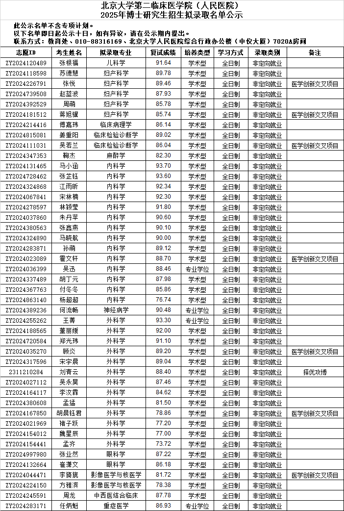 北京大学第二临床医学院(人民医院)2025年博士研究生招生拟录取名单公示