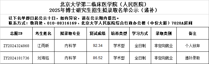 北京大学第二临床医学院(人民医院)2025年博士研究生招生拟录取名单公示(递补)