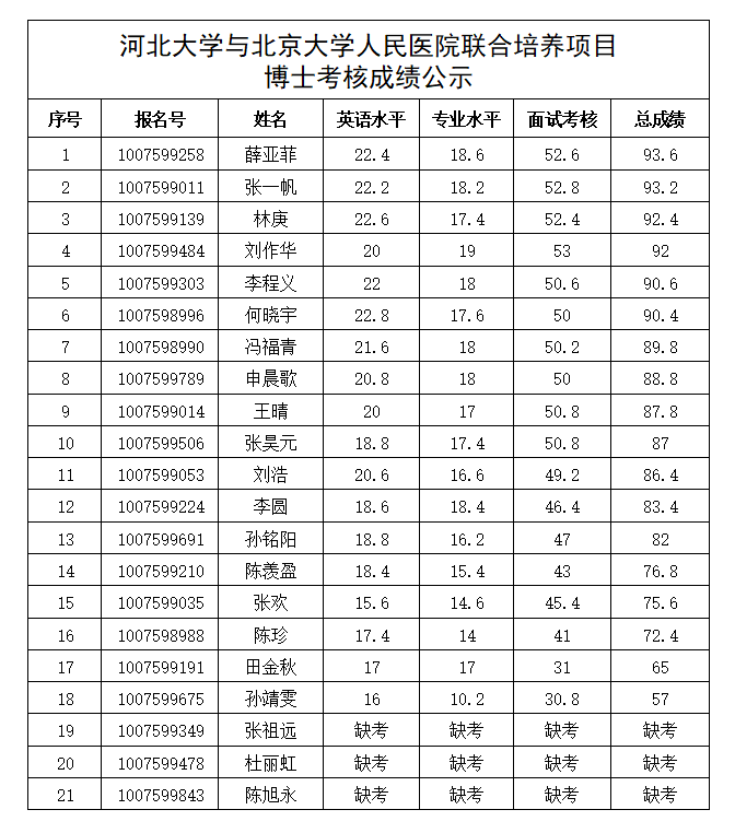河北大学与北京大学人民医院联合培养项目博士考核成绩公示