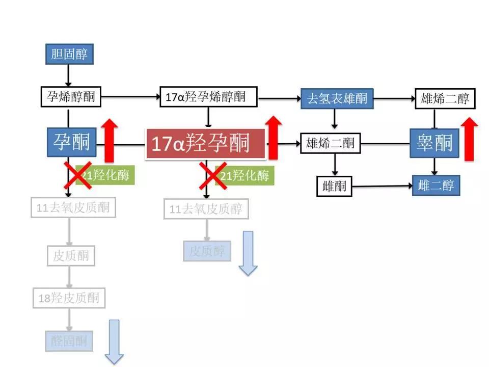 凡是通过21羟化酶催化的反应都走不通了,就会出现皮质醇和醛固酮这些激素都会下降甚至检测不出,而上层的激素则会堆积起来,临床检测时就会发现孕酮、17α-OHP和睾酮升高。