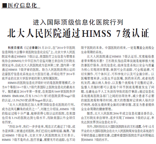 科技日报:我院通过HIMSS 7级认证