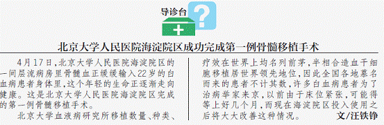 北京青年报:我院海淀院区成功完成第一例骨髓移植手术