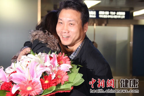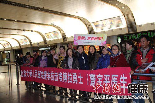 15日上午,北京首都机场二号航站楼接机口处,“曹叔,欢迎回家”、“北京大学人民医院援非抗击埃博拉勇士曹宝平医生”等标语格外引人注意。北京大学人民医院院办领导、急诊科医生和护士等人,在此迎接从几内亚埃博拉疫区归来的曹宝平医生。