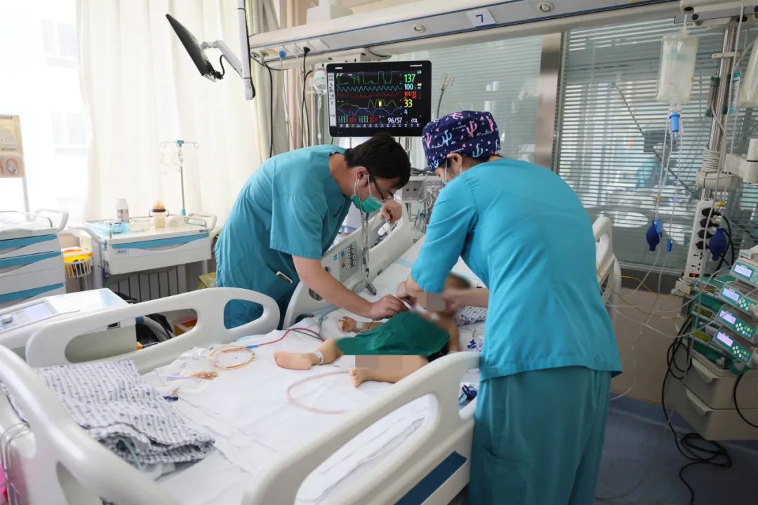手术过程中,由冯艺主任带领的麻醉团队严密患儿监测血压与中心静脉压(CVP)数值。由于宝宝体型非常小、动静脉血管非常纤细,主麻医生姜俪凡博士选择超声引导下穿刺,虽然难度大大增加,但可以最大程度减少穿刺中可能造成的损伤。