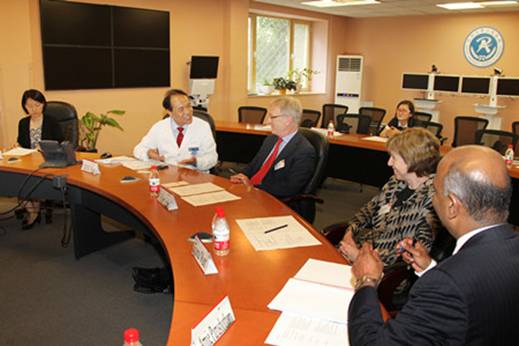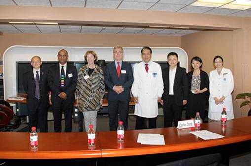 2014年6月10日,英国伦敦国王学院(King's College London, KCL)副院长Robert Lechler爵士一行4人在北京大学医学部国合处人员的陪同下来北京大学人民医院进行参观访问,王杉院长亲自接待了外宾。在北京大学人民医院网真会议室,王杉院长与外宾亲切座谈,刘帆院长助理、乳腺科王殊副主任、国合办任景怡副主任等出席了座谈会。