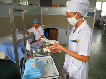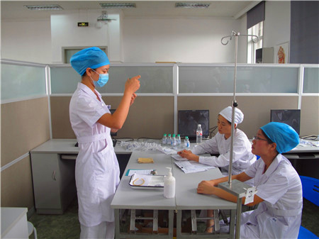 医学是患者“健康所系、性命相托”的一个职业,因此挑选人才的标准必须严格、谨慎。并不是每一个“订单”都能高枕无忧进入北京大学人民医院实习,每一名学员都是经过层层选拔的。北京大学人民医院护理部张海燕副主任介绍了订单培养护理学生的流程:北京大学人民医院教育处、护理部、临床各专业的专家每年都在学生的一年级第二个学期去订单培养合作学校挑选学生。这是一个双向选择的过程,合作学校通知一年级的学生报名,北京大学人民医院的专家考察报名学生各方面的成绩和表现,最后通过面试的学生组成“人民班”。学生二年级在学校进行专业课的培训,其中部分课程,特别是在技能训练时结合人民医院的操作要求和规范进行培养、训练。由于大多数学校都已经有老师到北京大学人民医院进修过,因此对医院的法律、人文环境、道德规范都比较熟悉,能够按照人民医院的要求对学生进行相关指导。第三年北京大学人民医院的专家再通过考察学生的动手能力、理解能力、可塑性等素质挑选符合要求的订单班学生和其他班优秀的学生来人民医院实习。每年7月,通过考核的学生来到北京大学人民医院实习。在进入临床实习前,还要先进行2周的集中训练,训练之后进行技能、理论考试,考试合格之后才能进入临床实习。