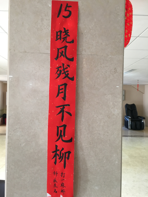 春节的喧嚣还没有散去,元宵节就喜气洋洋地来捧场了。2月10日,麻醉科为庆祝元宵佳节举办猜灯谜活动。这是一次特别的活动,谜面由麻醉科的能人们拟就,谜底由科室人员姓名组成。谜面丰富多彩、形式多样,有的拆字组词,有的释义成诗,还有的引经据典,或诗意浓浓,或韵味悠长,或大气优雅,彰显出麻醉科人深厚的文学功底,在拉近同事心与心距离的同时也高涨了节日氛围。谜题撰写于红纸之上,为毛笔小楷手书,字体端庄,赏心悦目,在浓浓的年味里体味着中国文化之美。这既是回归传统,也是回归自我,认同民族文化并与之呼应。