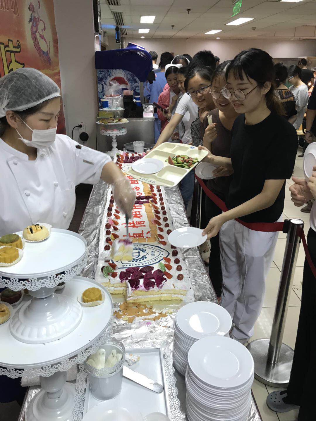 “北院餐厅制作了长三米,宽0.5米的大蛋糕,供职工免费品尝。每日还推出一款地方性特色风味小吃,如老北京炸酱面、红油抄手等,请职工们品鉴。中秋节是我国的传统佳节,我们还特别制作了带有北京大学人民医院字样的月饼请职工们品尝。”北院食堂经理兴致勃勃地说道,“聚贤餐厅的美食节也是由我们承办,除了增加西点、水果和饮料外,更增加了传统特色美食,让职工们吃得舒心、吃得营养。