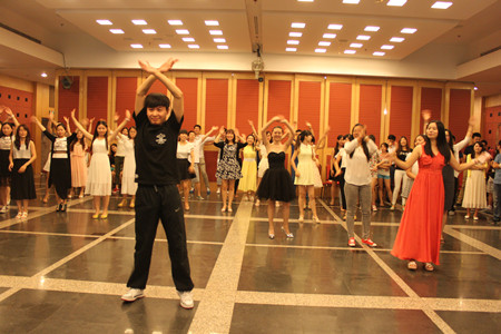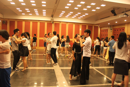 特邀的舞蹈教师所带来的伦巴舞蹈充分调动起了现场的热情,紧接着大家在动感十足的兔子舞中正式拉开舞会帷幕。在专业舞蹈老师的带领下,一首首舞曲慢慢展开,一对对搭档在灯光、音乐、笑声中各显才华,舞姿翩翩。舞步简单柔美的慢三,节奏强烈鲜明的快四,将现场气氛一次又一次地推向高潮。之后进行的“松鼠和大树”、“牛郎和织女”、“挑战大魔王”等小游戏也在热情呼应中顺利进行,使参与者在轻松愉快的气氛中加强了沟通交流。大家兴致高涨,伴随着优美的音乐迈着曼妙的舞步陶醉在舞池中。舞会最后经过现场观众的投票,评选出整场舞会的“舞王”和“舞后”。在激情四射的《小苹果》舞蹈中,迎新舞会落下帷幕。