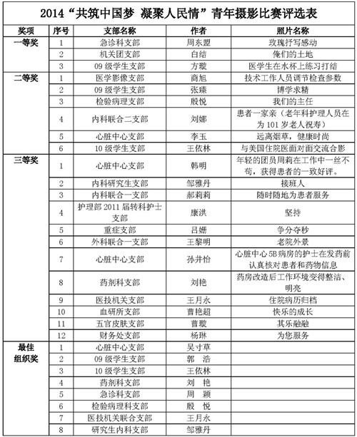 为在医院广大青年中营造传递“中国梦”正能量的良好氛围,引导广大团员青年挖掘美丽身边人、身边事,展现人民人风采,北京大学人民医院团委于2014年8月在全院青年团员范围内开展了“共筑中国梦·凝聚人民情”青年摄影比赛。