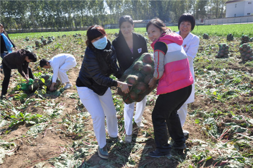 大家齐心协力、干劲十足,在田间地头热火朝天地劳动着,不到1个半小时就从一垅垅的地里拔出卞萝卜1万多斤,田地间顿时挂起了一片红灯笼,喜庆而壮观。大家还将这万余斤卞萝卜一起装袋,并将平均重量每袋80斤的卞萝卜一袋袋搬运到集装箱车上,回去分给各科室的职工。男同事连连赞叹女同事:“咱医院的半边天真能干,真是好样的!”