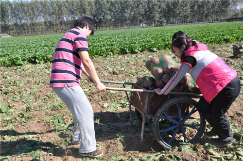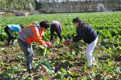 北京大学人民医院职工活动基地继玉米丰收之后,又开始迎来今年的萝卜丰收,又大又圆紫红色的卞萝卜在各类萝卜中首先成熟了。2014年10月13日,部分工会干部来到基地为职工采摘卞萝卜。