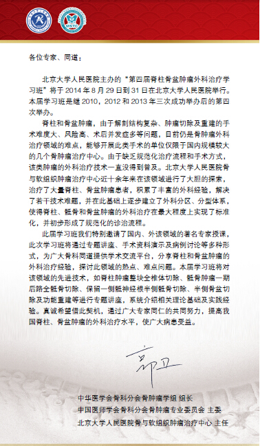 北京大学人民医院主办的“第四届脊柱骨盆肿瘤外科治疗学习班”将于2014年8月29日到31日在北京大学人民医院举行。本届学习班是继2010,2012和2013年三次成功举办后的第四次举办。