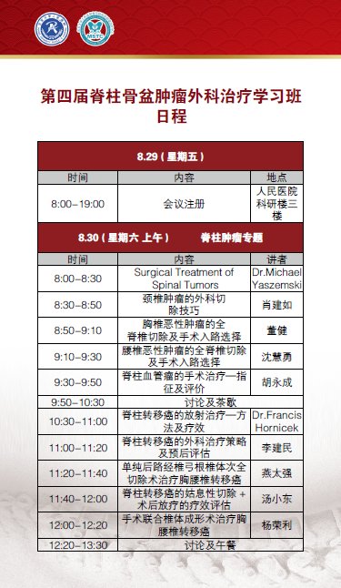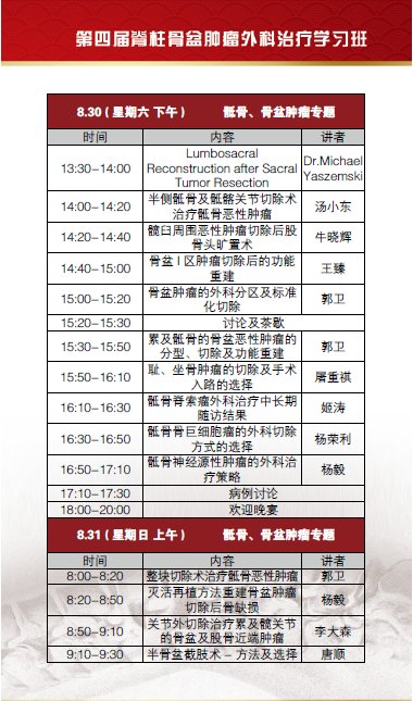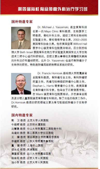 此届学习班我们特别邀请了国内、外该领域的著名专家授课,此次学习班将通过专题讲座、手 术资料演示及病例讨论等多种形式,为广大骨科同道提供学术交流平台,分享脊柱和骨盆肿瘤的外科治疗经验,探讨此领域的热点、难点问题。本届学习班将对该领 域的先进技术,如脊柱肿瘤整块全椎体切除、骶骨肿瘤一期后路全骶骨切除、保留一侧骶神经根半侧骶骨切除、半侧骨盆切除及功能重建等进行专题讲座,系统介绍 相关理论基础及实践经验。真诚希望借此契机,通过广大专家同仁的共同努力,提高我国脊柱、骨盆肿瘤的外科治疗水平,使广大病患受益。