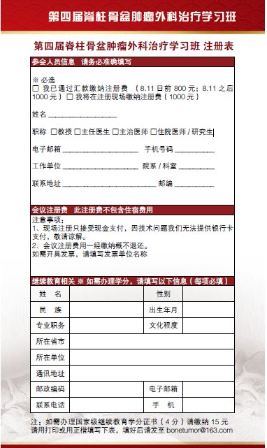 网上报名: 请务必于报到前完成学员网上报名,否则无法如期获得继续教育学分。报名地址网址:http://jjgl.bjmu.edu.cn/ci/web.temp.index.do(北京大学医学部继续医学教育项目管理信息系统),点击右侧“项目报名”按钮,查找项目“第四届脊柱骨盆肿瘤外科治疗学习班”,点击“报名入口”填写个人信息。