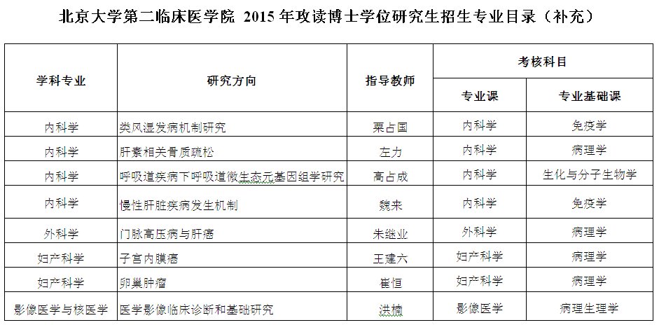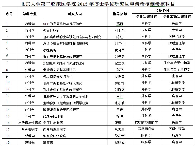 (2)专业基础知识:考核科目参见《北京大学第二临床医学院2015年博士学位研究生申请考核制考核科目》(见附件)。