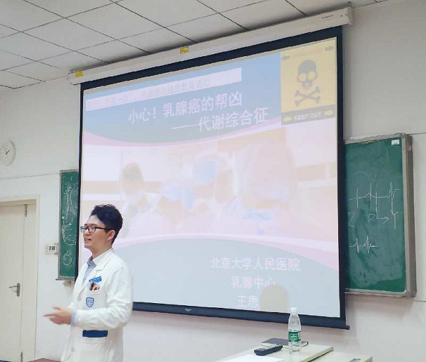 宣讲活动首先由乳腺外科党支部组织委员王思源医生为大家带来以“运动与肿瘤”为主题的健康讲座,王医生结合了自身减肥经历,为大家深入浅出的讲解了肥胖的害处,特别告诉大家减重会提高乳腺癌长期治疗效果,提高生存,并提出了适用于乳腺癌术后患者合理安全的运动方式的建议。