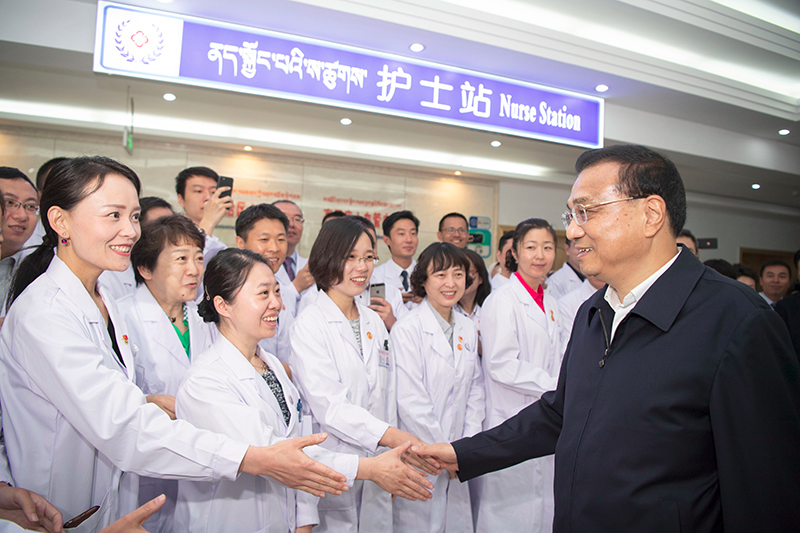 7月27日上午,中央政治局常委,国务院总理李克强来到西藏自治区人民医院,看望慰问援藏医务人员。总理指出:“你们都是来自祖国四面八方的优秀医护人员,西藏这些年医疗设施建设有了长足发展,但优秀医护人才仍很短缺。你们远离家人、无私奉献来到这里,令人感动。我希望你们既要当好医生,治病救人;又要当好老师,带好徒弟。来的时候是一支医疗队,走的时候留下一大批白衣天使。”