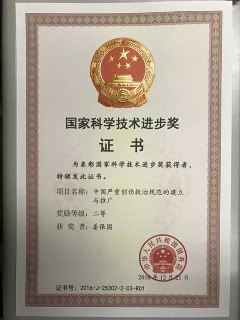 姜保国中国严重创伤救治规范体系获国家科学技术进步二等奖