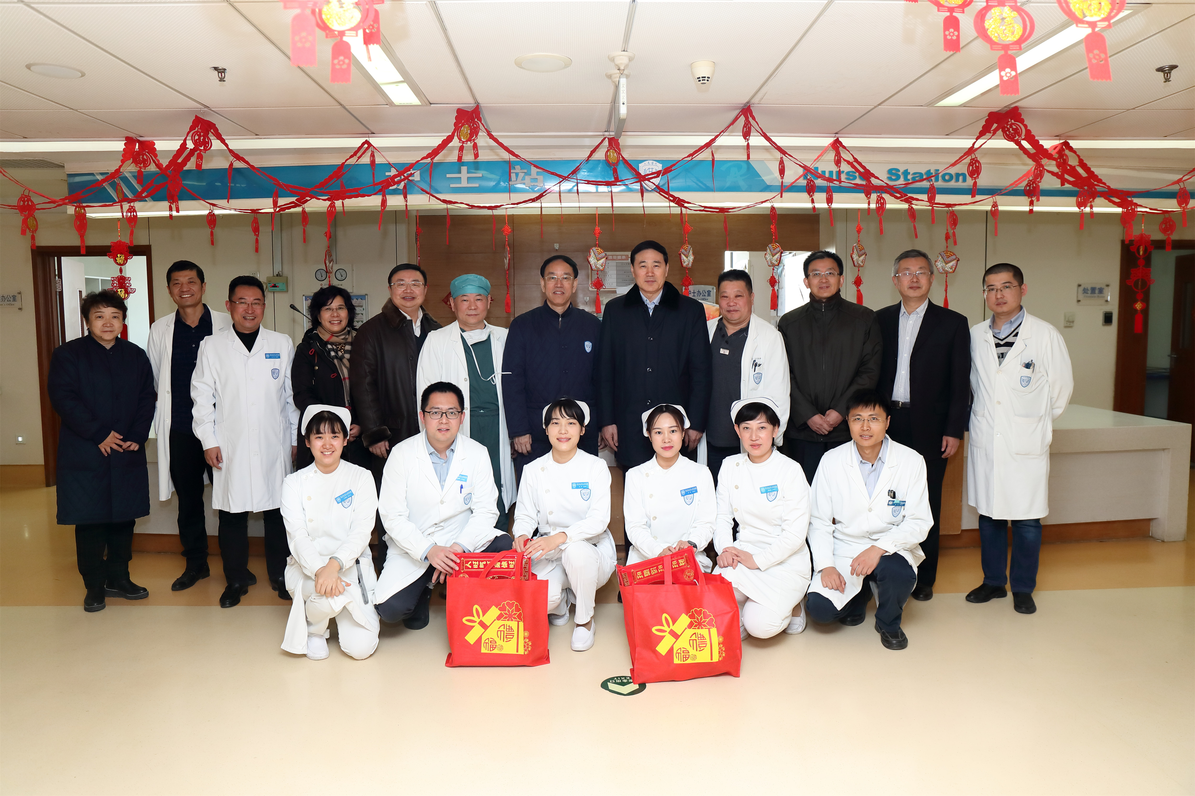 北京大学党委副书记、医学部党委书记刘玉村,北京大学医学部副主任王维民、刘晓光,医学部党委副书记朱树梅,医学部党委宣传部部长焦岩,在北京大学人民医院姜保国院长、党委赵越书记、张俊副院长、刘玉兰副院长、王建六副院长、李澍副院长、党委陈红松副书记、郭静竹副书记、纪委苏茵书记的陪同下,先后来到风湿免疫科和骨肿瘤科病房,为临床一线医护人员送去新春祝福。