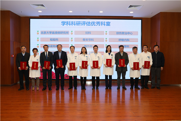 医院根据各学科的科研基金和科研产出为各学科进行科研评估,北京大学血液病研究所、检验科、风湿免疫科、北京大学肝病研究所、骨肿瘤科。妇科、骨关节科、胸外科、内分泌科、泌尿外科。创伤救治中心、呼吸内科、创伤骨科、眼科、消化内科15个优秀学科分别获得科研评估优秀科室奖。