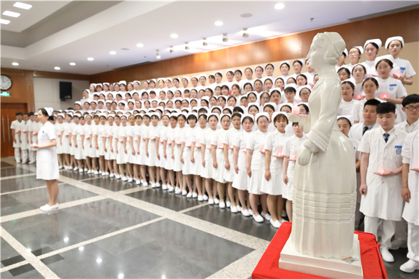 南丁格尔塑像前,在护理部王泠主任的引领下,年轻护士庄严宣誓。