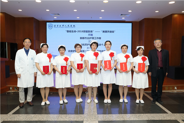 姜保国院长、赵越书记为“敬佑生命·2018荣耀医者-美丽天使奖”、首都杰出护理工作者、北京市优质护理服务先进个人、北京大学医学部第六届“天使之星”、“北京护理学会第三届护理科技进步奖优秀奖”获奖者颁奖