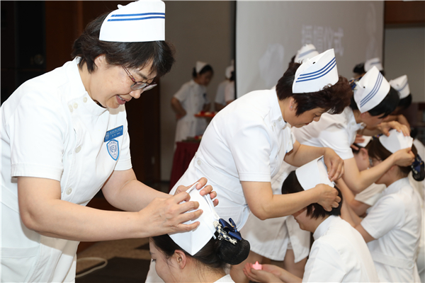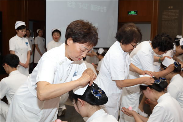 165名年轻护士身着洁白的护士服,由护理前辈、护理部主任、科护士长们为他们戴上圣洁的燕帽,将象征着南丁格尔精神的蜡烛传递到他们手中。