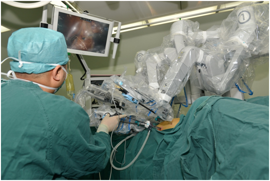 外科手术机器人,又称“达芬奇(da Vinci)手术机器人”、“内窥镜手术器械控制系统”,通过使用微创方法,实施复杂的外科手术,是目前世界上最先进的手术平台。机器人手术目前主要用于普外科(肝胆、胰腺、胃肠道、甲状腺等)、心脏外科、胸外科、泌尿外科、妇科、小儿外科、咽喉头颈外科等。在手术时,外科医生可以远离手术台坐在操纵台中,双手握住手柄,同步控制患者体内的机械臂手术器械进行手术,所以完全不同于传统的直接将手伸入患者体内进行手术的概念。