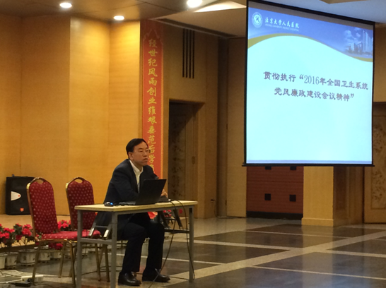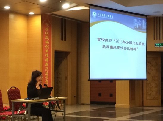 党委陈红书记在讲话中强调党风廉政建设和反腐败斗争永远在路上,全体党员及全院教职员工要认真学习贯彻执行2016年全国卫生系统党风廉政建设工作会议精神,深入学习《中国共产党廉洁自律准则》和《中国共产党纪律处分条例》,以“六项”纪律为戒尺,拧紧螺丝,以实际行动扎实推进党风廉政建设和反腐败斗争工作。
