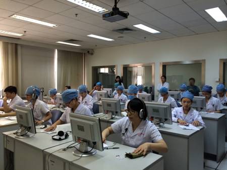 与此同时,阅卷及分数核录工作在阅卷区同步进行。阅卷人严格对照评分标准对笔试试卷进行评阅;考务人员对笔试、上机、临床技能操作三部分考试成绩逐一进行核对、加总、誊录。此次考试共组织考官69人,考务人员及引导员16人,仅用7小时就完成了359名考生的考试任务。