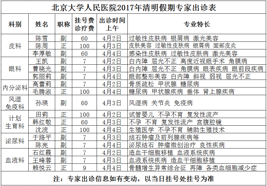 北京大学人民医院2017年清明假期专家出诊表