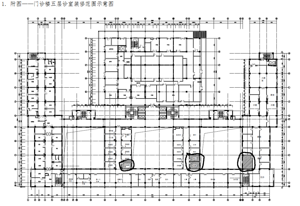 1、事由:门诊楼五层候诊区改造三间诊室,会诊中心翻新。