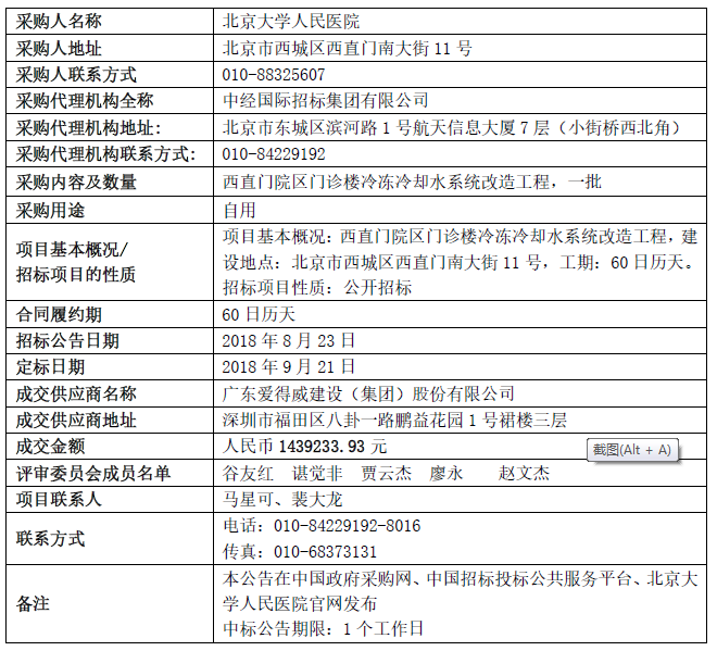 北京大学人民医院西直门院区门诊楼冷冻冷却水系统改造工程中标公告