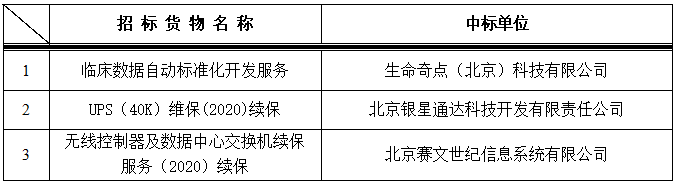 我院信息中心于2020年6月2日对以下信息系统项目进行院内招标,中标结果如下: