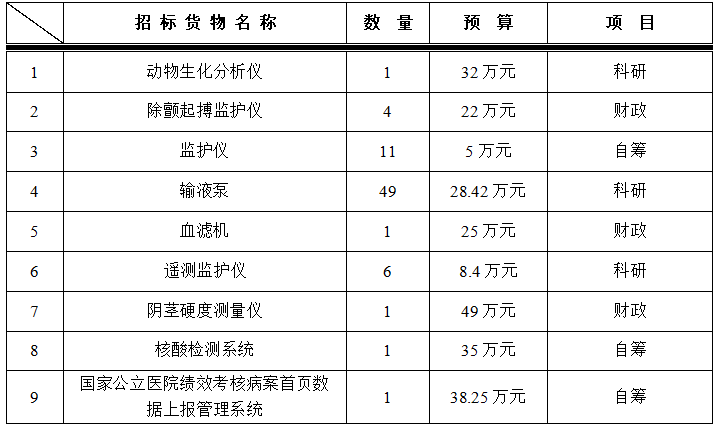 为满足临床科室需求,医学装备处拟对以下设备进行院内招标采购,采购项目的内容及数量: