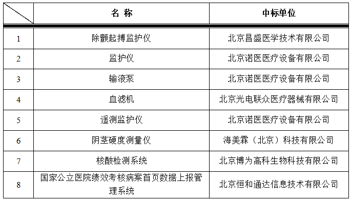 我院于2021年11月4日对以下医疗设备进行院内招标,中标结果如下: