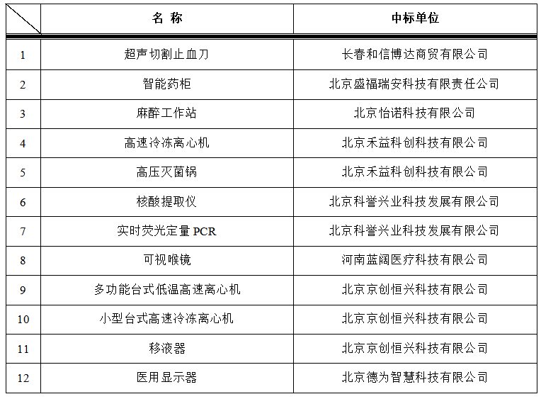 我院于2022年11月25日对以下医疗项目进行院内招标,中标结果如下: