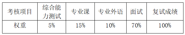 复试成绩采用综合计分办法,实行百分制,60分及格。各部分权重如下: