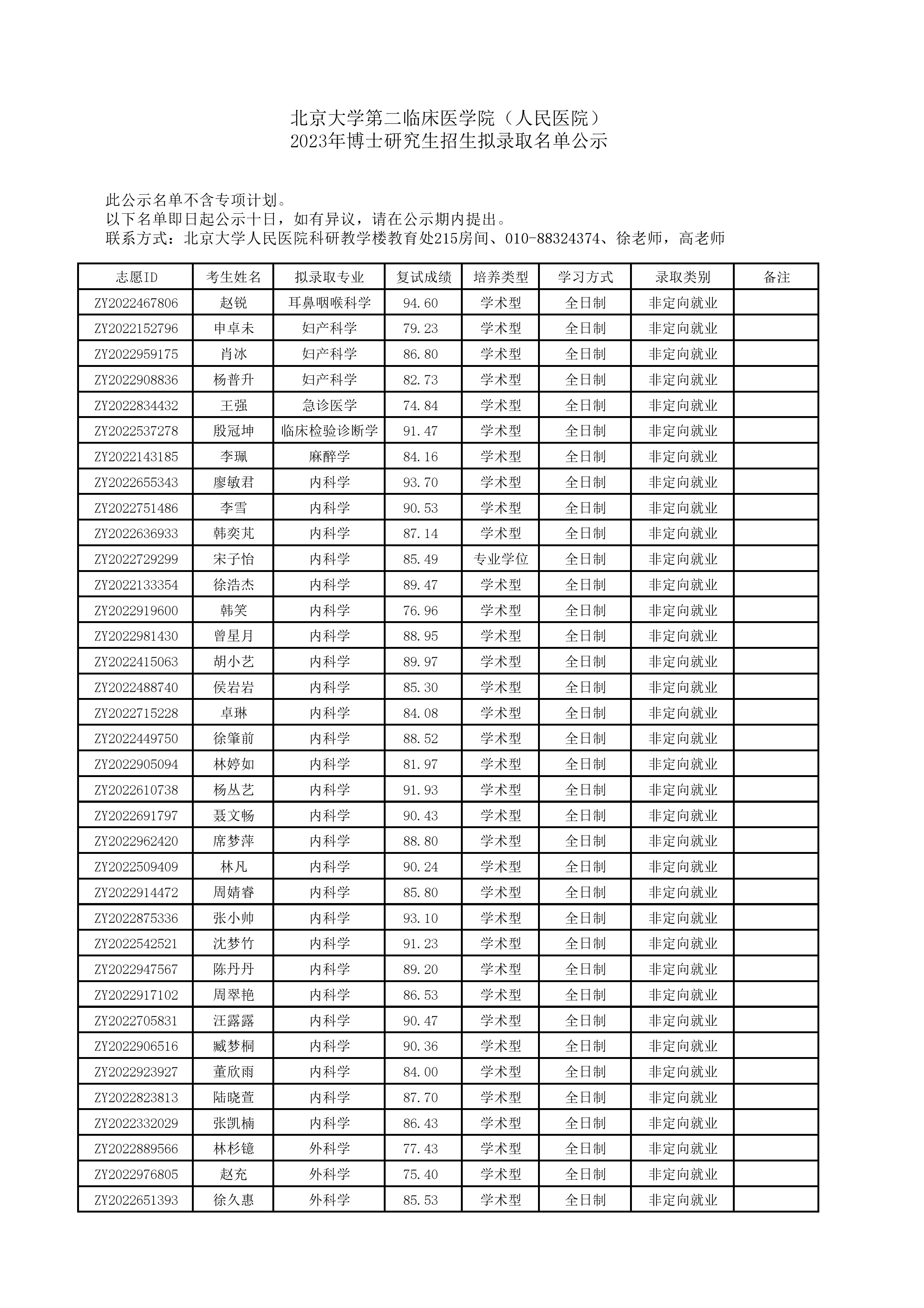 北京大学第二临床医学院(人民医院) 2023年博士研究生招生拟录取名单公示