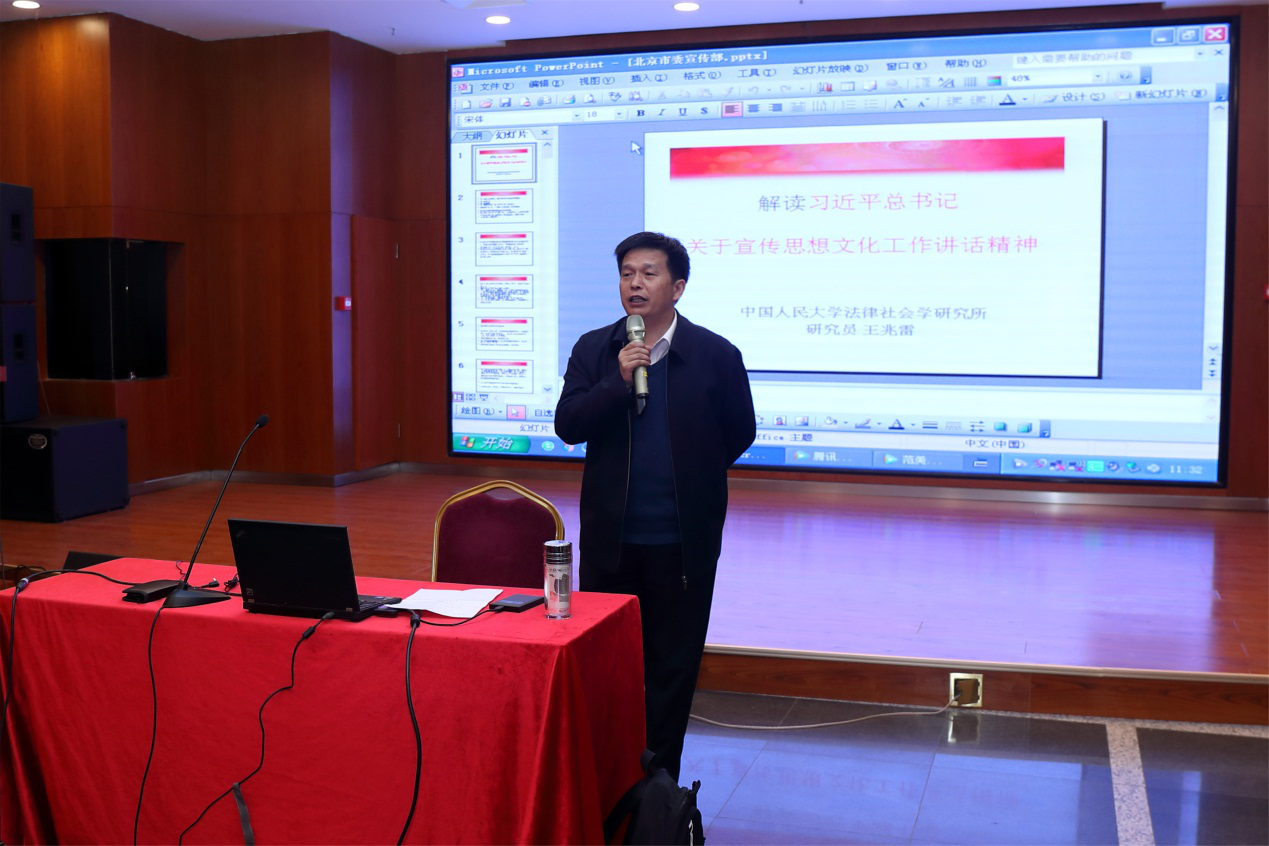 为学习贯彻“党的十九大精神”、新时期“两会”精神,认真领会“四个自信”,弘扬中华民族优秀传统文化,坚定树立文化自信,北京大学人民医院医务处、医技机关联合、离退休、机关一、机关二、机关四、学生研究生等8个党支部和团委共同于2019年3月18日中午在陆道培学术报告厅成功举办了“聆听历史述说 增强文化自信 厚植爱国情怀”医学部党建立项系列活动第一期活动。活动邀请中国人民大学法律社会学研究所研究员王兆雷为大家做“关于中华文化自信的理性思考”主题讲座。共有160多名党员、团员参与本次活动。